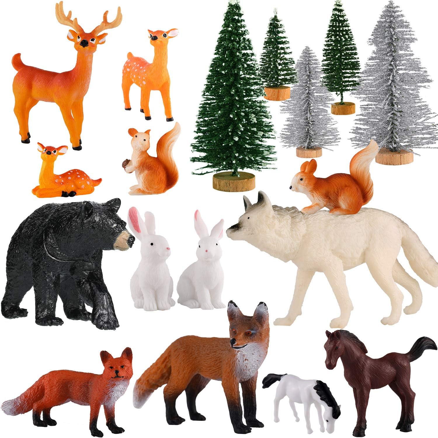 - What’s included: comes with 18 pieces of wild animals figurines, includes 13 pieces different animals and 5 pieces different trees, such as squirrel, horse, rabbit, elk, wolf, bear, and Christmas trees; The animal figurine is about 1.5 to 5.2 inch in length and 0.79 to 2.76 inch in height