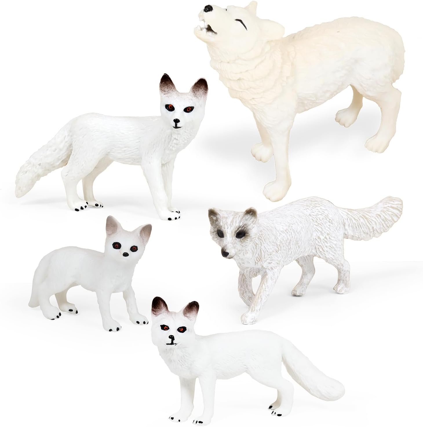 - Package Included:You will received 4 different arctic white fox animal figures toy + 1pc white wolf figure model toy, vivid and realistic appearance for your DIY figure project.