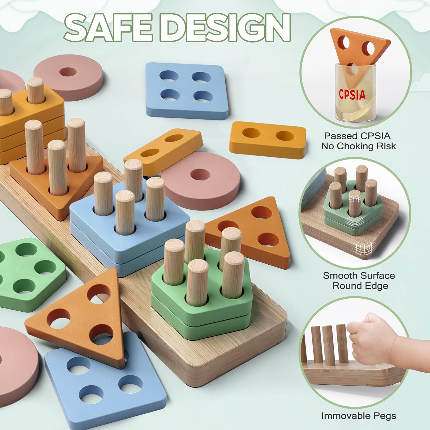 - Quality and Safety First: Our upgraded natural solid wood base with immovable pegs is thicker and heavier than other plywood ones, it’s more sturdy and durable. Blocks are covered with food safe paint that are non-toxic, odorless and anti-fade, and they won’t stick together. Smooth surface and round edges protect your baby’s little hands from scratching. There’s no choking hazard as the montessori baby toys passed the CPSIA 963 widget test.